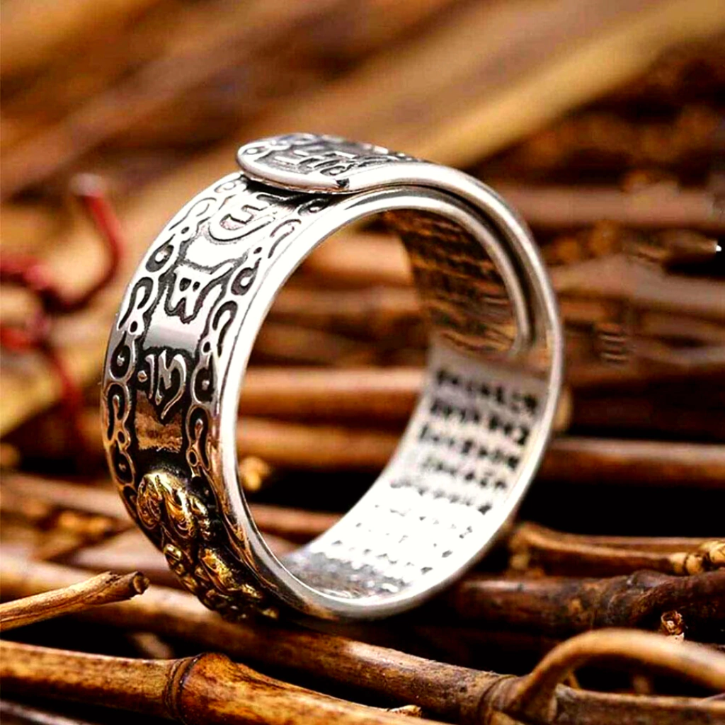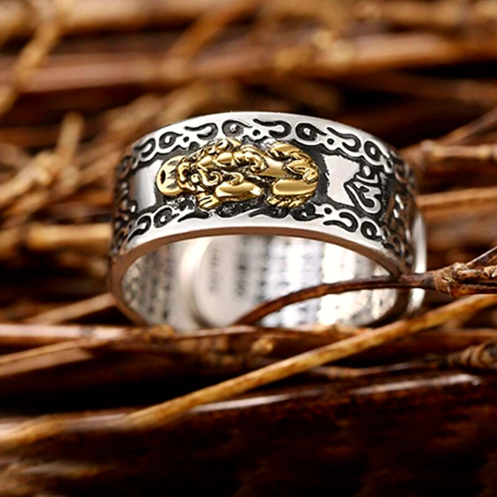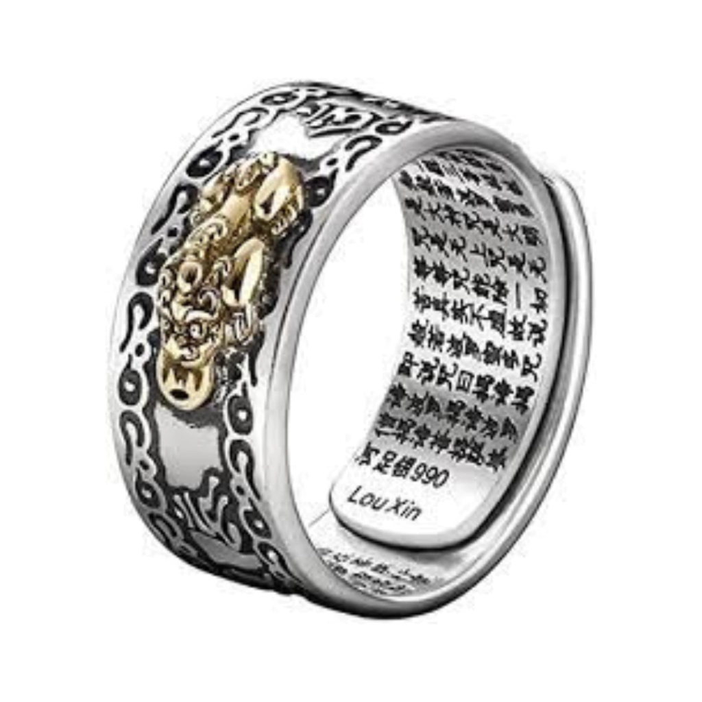 O Pixiu é uma criatura influente e auspiciosa para riqueza, e diz-se que tem um apetite voraz exclusivamente por ouro, prata e joias. Portanto, Pixiu sempre foi considerada como criaturas auspiciosas que possuíam poderes místicos capazes de atrair riqueza de todas as direções. No interior do anel está escrito junto com vários símbolos antigos, palavras de energização: Om Mani Padme Hum Esse é o mantra mais comum no Tibete. É considerado um mantra de alto poder criativo e espiritual.