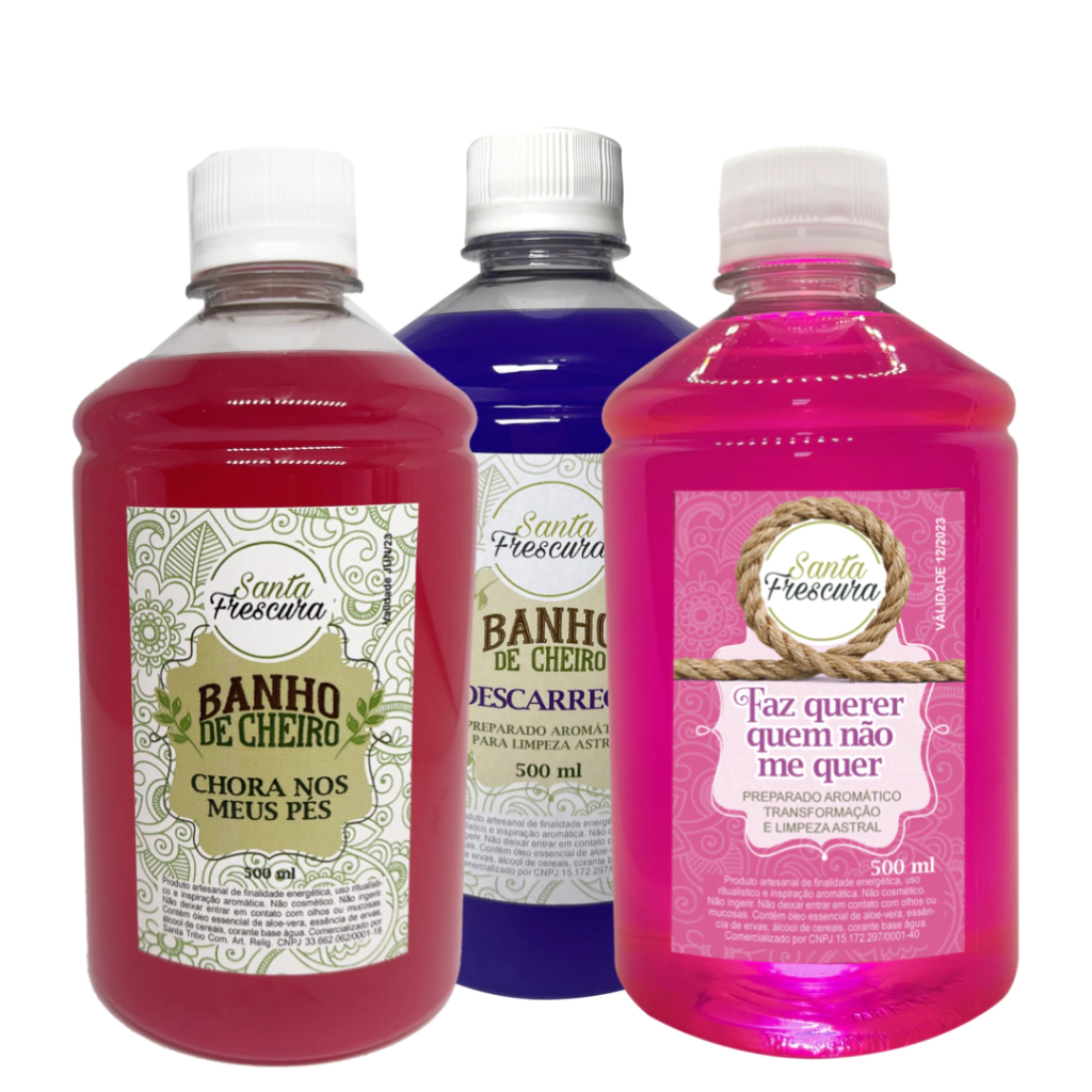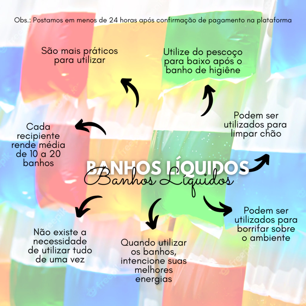 Os Banhos energéticos são ideais para nos auxiliar no nosso dia a dia, diminuindo tensões, angústias, abrindo caminhos, trazendo a energia da prosperidade, da proteção, afastando as energias negativas, olho gordo, mau olhado, estimulando a boa sorte, melhorando a autoestima. Hoje trabalhamos com os seguintes banhos líquidos: Mel, Faz querer quem não me quer, Carrapato, Rosas Brancas, Flor de Laranjeira, Chora nos meus Pés, Abre Caminhos, Alfazema, Sete Ervas, Chama Dinheiro, Rosas Vermelhas, Amaci, Anil, Amor, Prosperidade, Descarrego, Sorte Rápida.