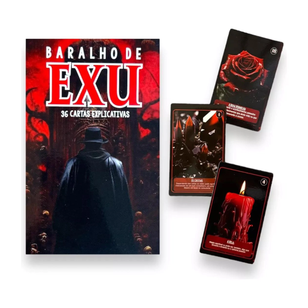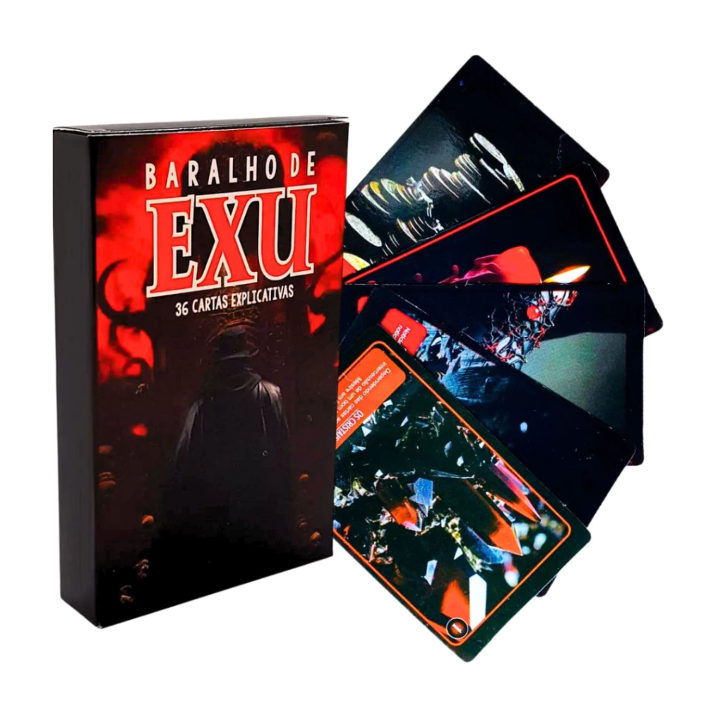 O Baralho de Exu é um poderoso instrumento oracular que mergulha na energia enigmática e transformadora de Exu, a divindade guardiã dos caminhos, mensageiro dos Orixás e senhor das encruzilhadas. Cada carta deste baralho carrega o poder e a sabedoria de Exu, refletindo sua dualidade e complexidade, capaz de abrir caminhos, trazer luz às sombras e proporcionar clareza em momentos de indecisão. Ao utilizar o Baralho de Exu, o consulente se conecta com a força primordial que rege o movimento, a comunicação e a transformação, recebendo orientações que podem desatar nós, remover obstáculos e guiar em decisões importantes. Este baralho é especialmente útil para quem busca entender as dinâmicas ocultas por trás das situações da vida, revelando tanto as oportunidades quanto os desafios. A leitura das cartas oferece um caminho direto para se comunicar com Exu, trazendo à tona verdades profundas, alertas e conselhos valiosos para seguir em frente com confiança e determinação, sempre sob a proteção e orientação desse poderoso Orixá.