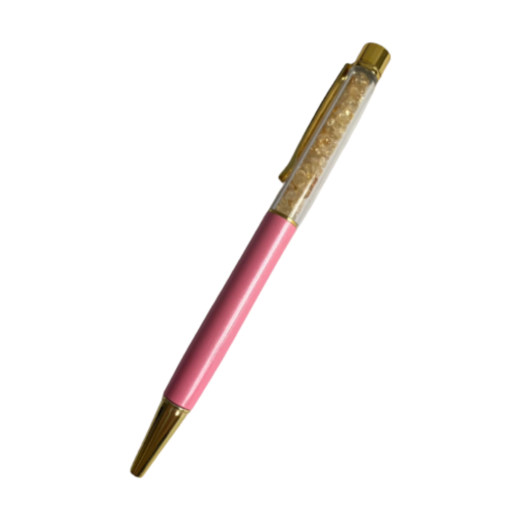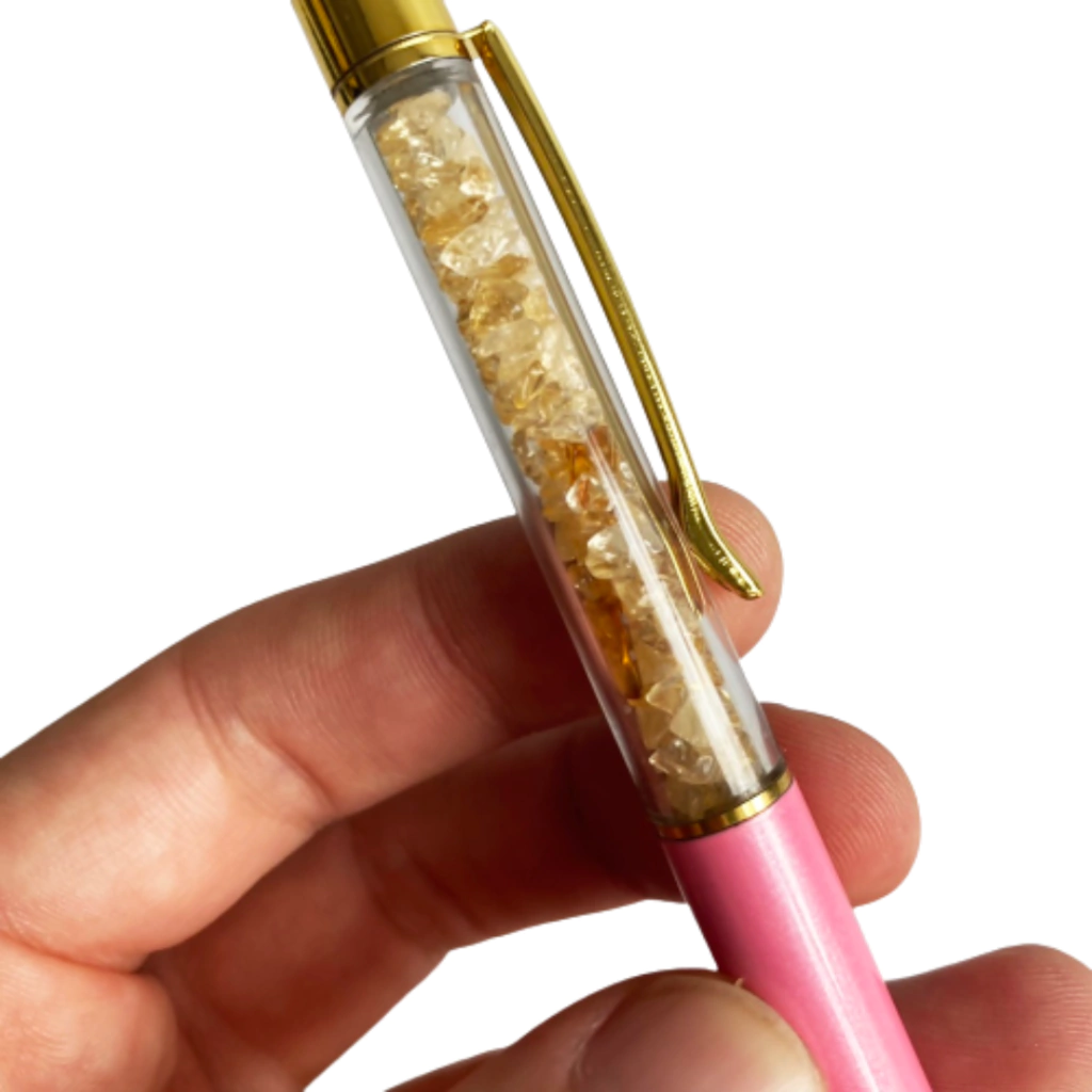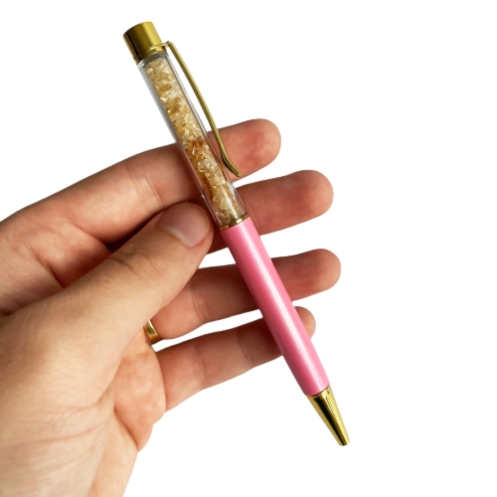 As Canetas de Cristais Naturais são super estilosas, além de trazerem o poder dos cristais bem pertinho de nós. Elas possuem tinta preta e um recipiente com cristais cascalhos. O seu acabamento é cromado e tubo rosa. Ideal para presentear e ter boas energias das pedras em nossas mãos. É possível substituir a carga da caneta.