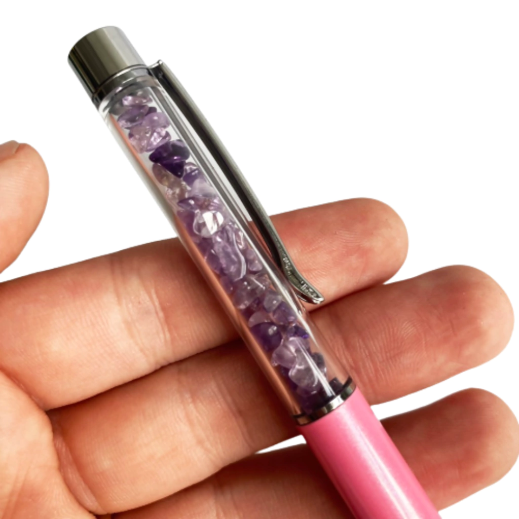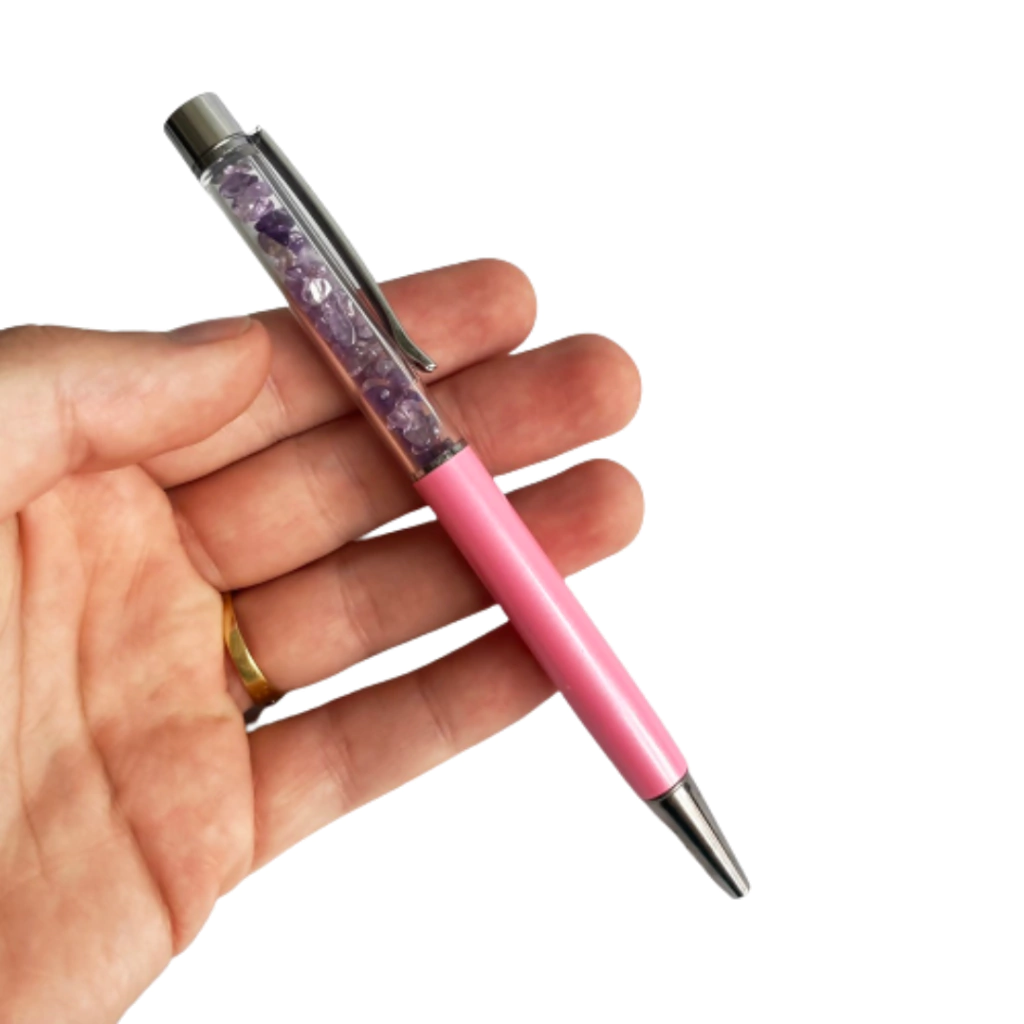 As Canetas de Cristais Naturais são super estilosas, além de trazerem o poder dos cristais bem pertinho de nós. Elas possuem tinta preta e um recipiente com cristais cascalhos. O seu acabamento é cromado e tubo rosa. Ideal para presentear e ter boas energias das pedras em nossas mãos. É possível substituir a carga da caneta.