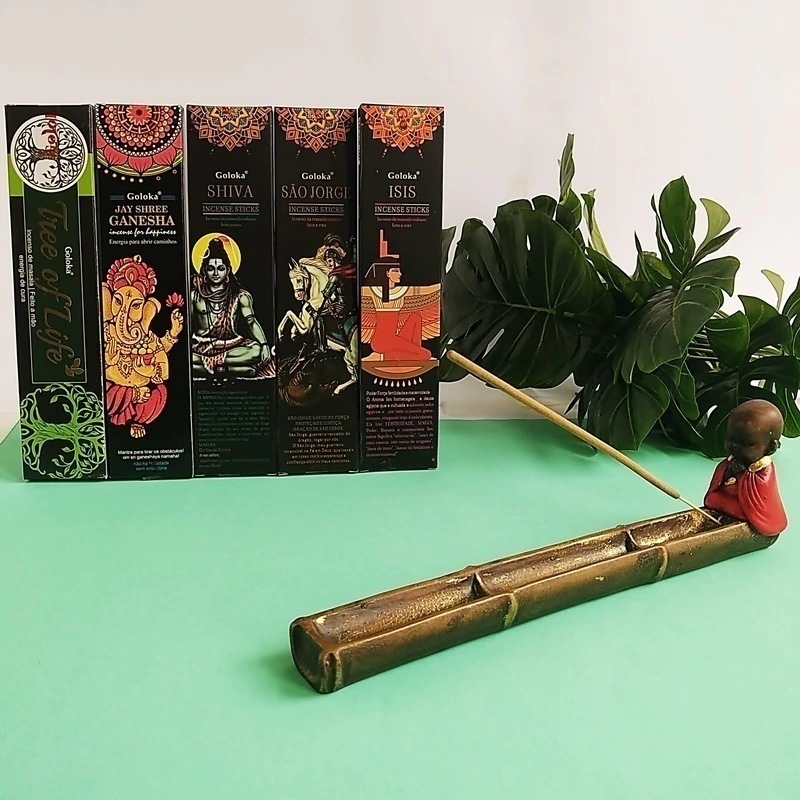 Incenso Premium Goloka de Massala. Esse tipo de incenso é excelente para quem aprecia qualidade e duração de aroma. Além de ajudar a limpar e purificar o ambiente e remover as vibrações ruins, ajuda a equilibrar os chakras e é ideal para práticas de meditação e yoga. Os incensos Goloka são feitos com uma base de sândalo e óleos essenciais extraídos de flores por processo de destilação.