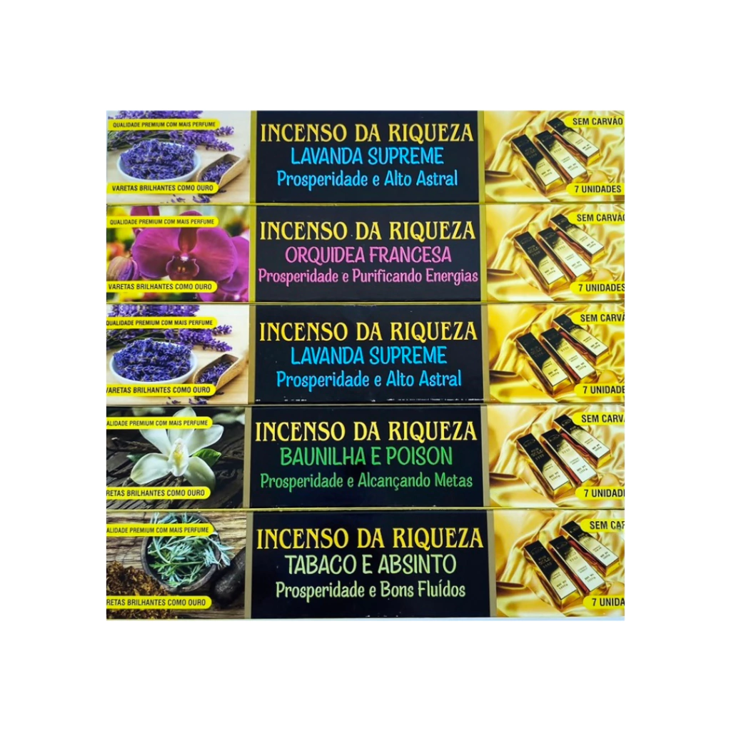 Suas varetas sao douradas com brilho, ampliando a energia do dinheiro e prosperidade além de seus aromas serem maravilhosos.