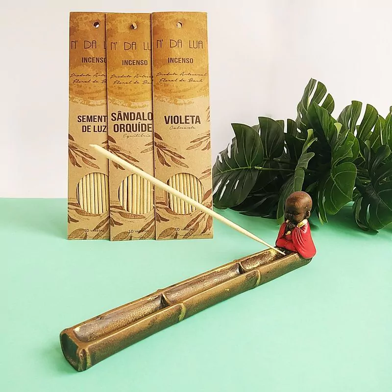 A produção do incenso inicia na união das matérias-primas naturais e selecionadas com o devido cuidado. Tem como base a fécula de mandioca - um composto natural que a mãe terra nos fornece como um presente. É livre de carvão vegetal e outros componentes tóxicos para o organismo, o que faz dele ser suave mas possuir a presença necessária para o ambiente.