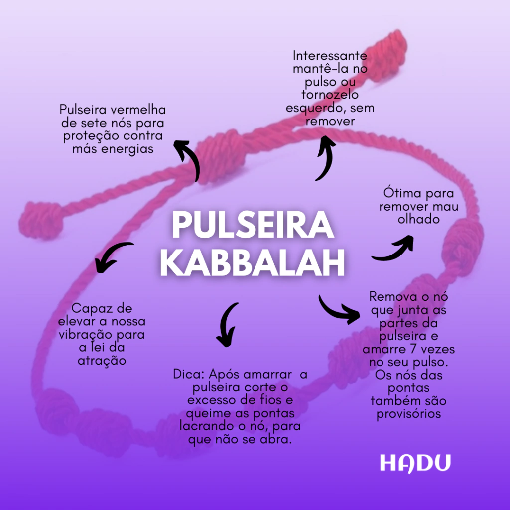A pulseira Kabballah é considerada uma espécie de amuleto de proteção contra as más energias e ajuda atrair sorte. Deve ser amarrada na mão esquerda, pois é o lado pelo qual o corpo e a alma recebem todo tipo de energia; e nesta ocasião, as mais especiais são as energias protetoras. Peça para alguém especial coloca-la em você.