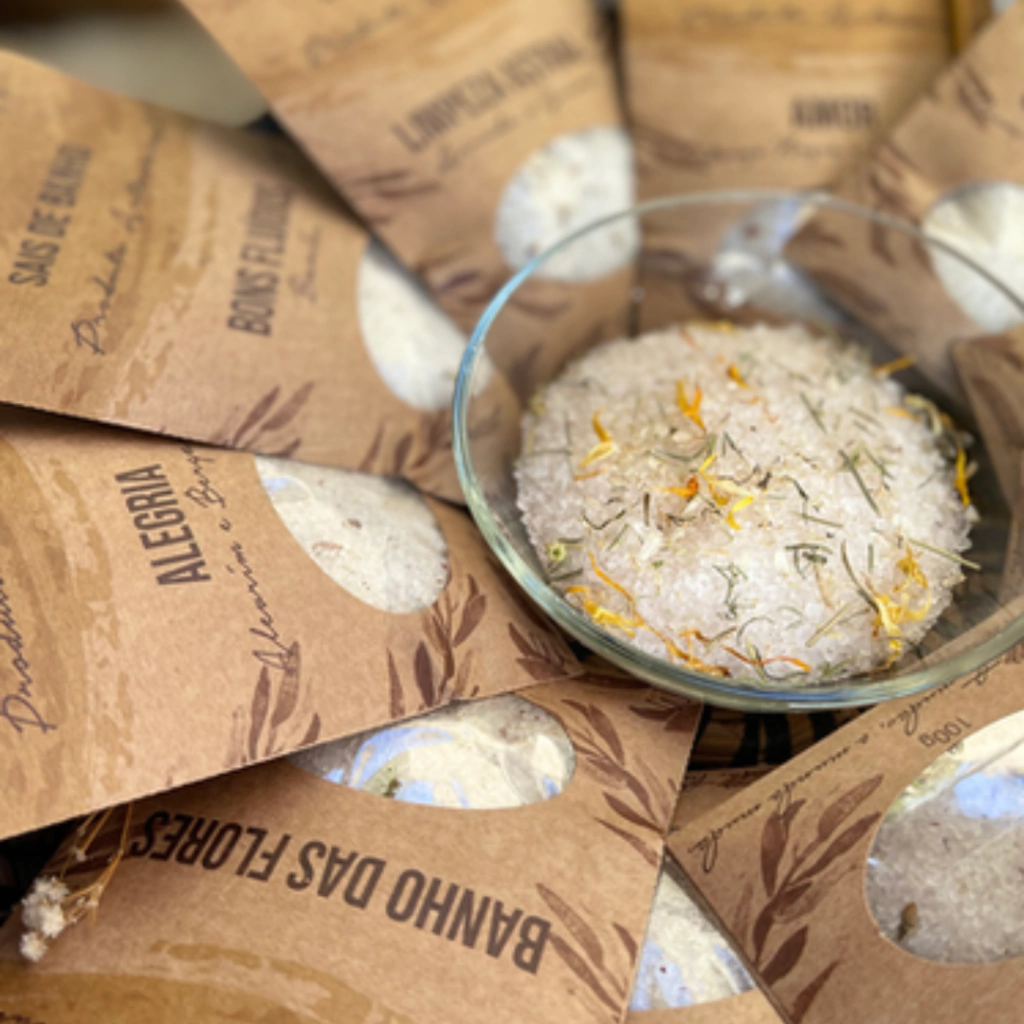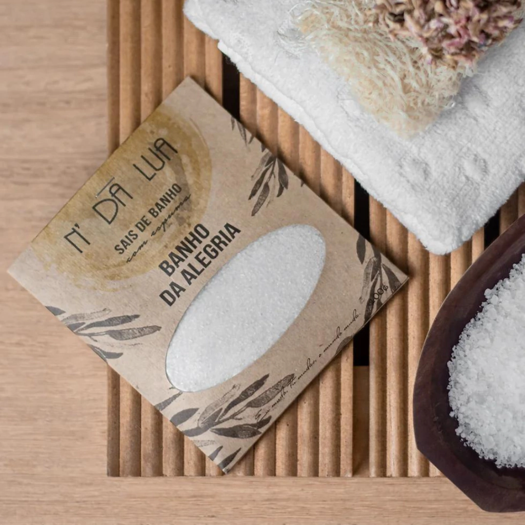 Adicione uma quantidade generosa dos sais de banho à água morna e mergulhe por 20 a 30 minutos. Sinta os aromas envolverem você, trazendo calma e renovação. Serve também como escalda-pés ou banho energético.
