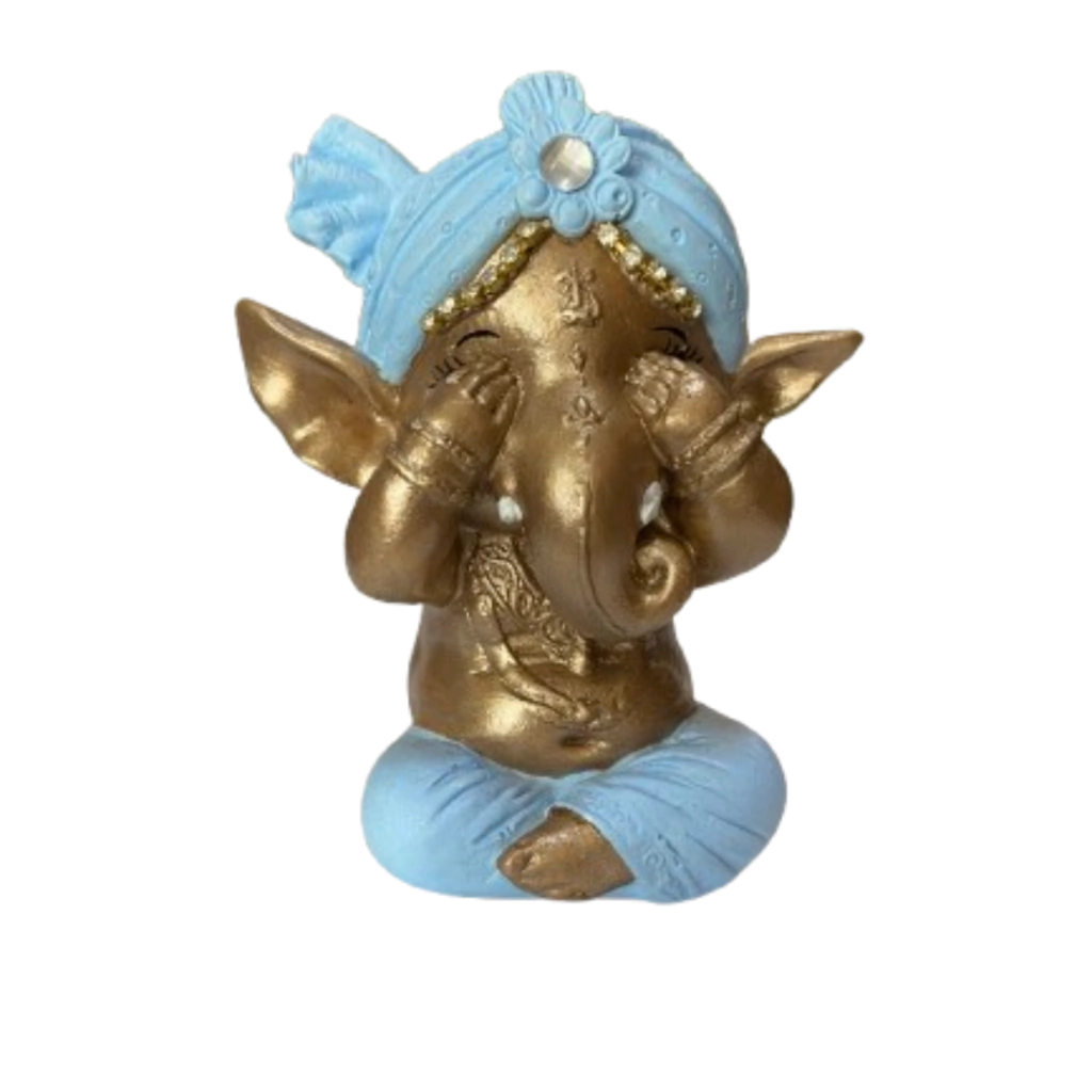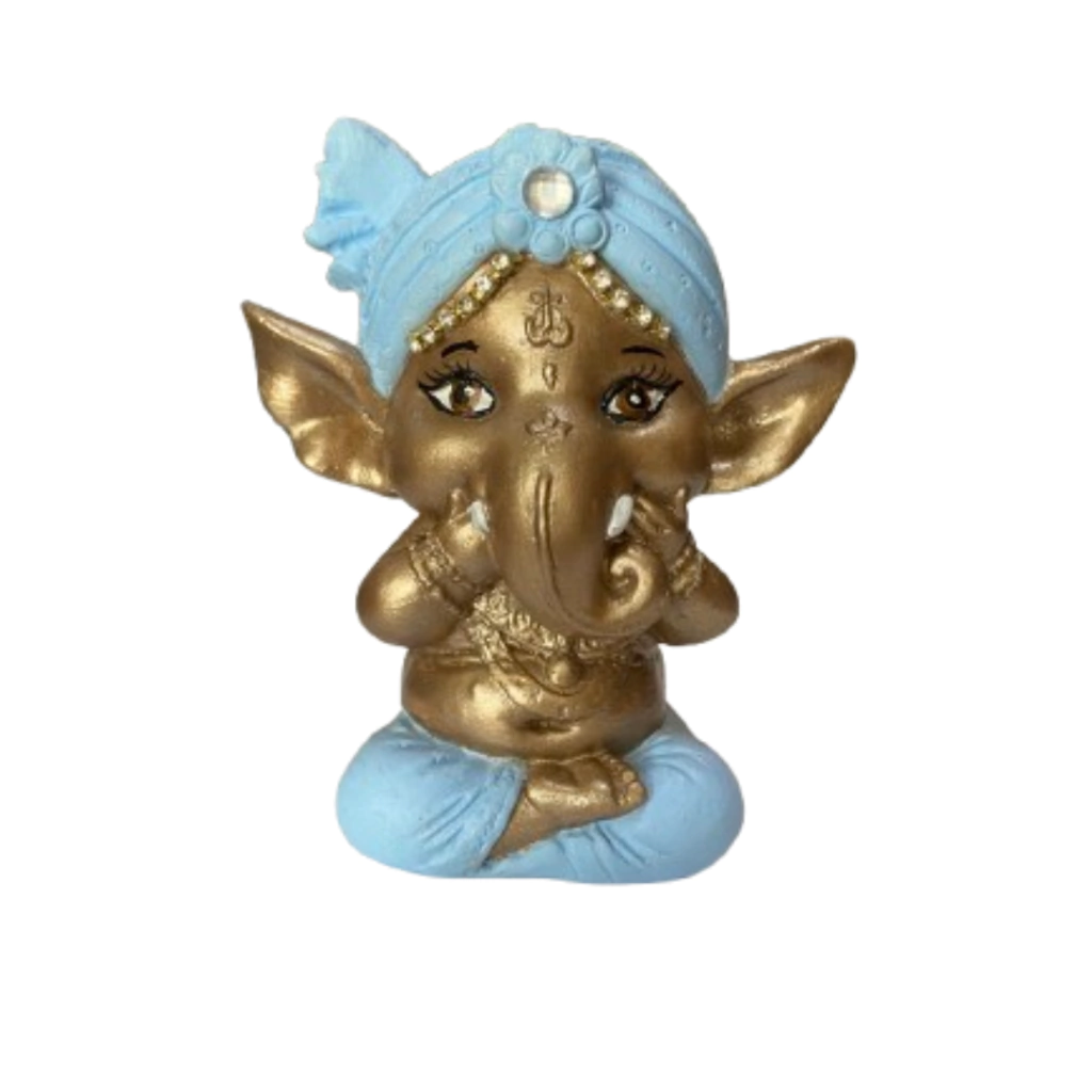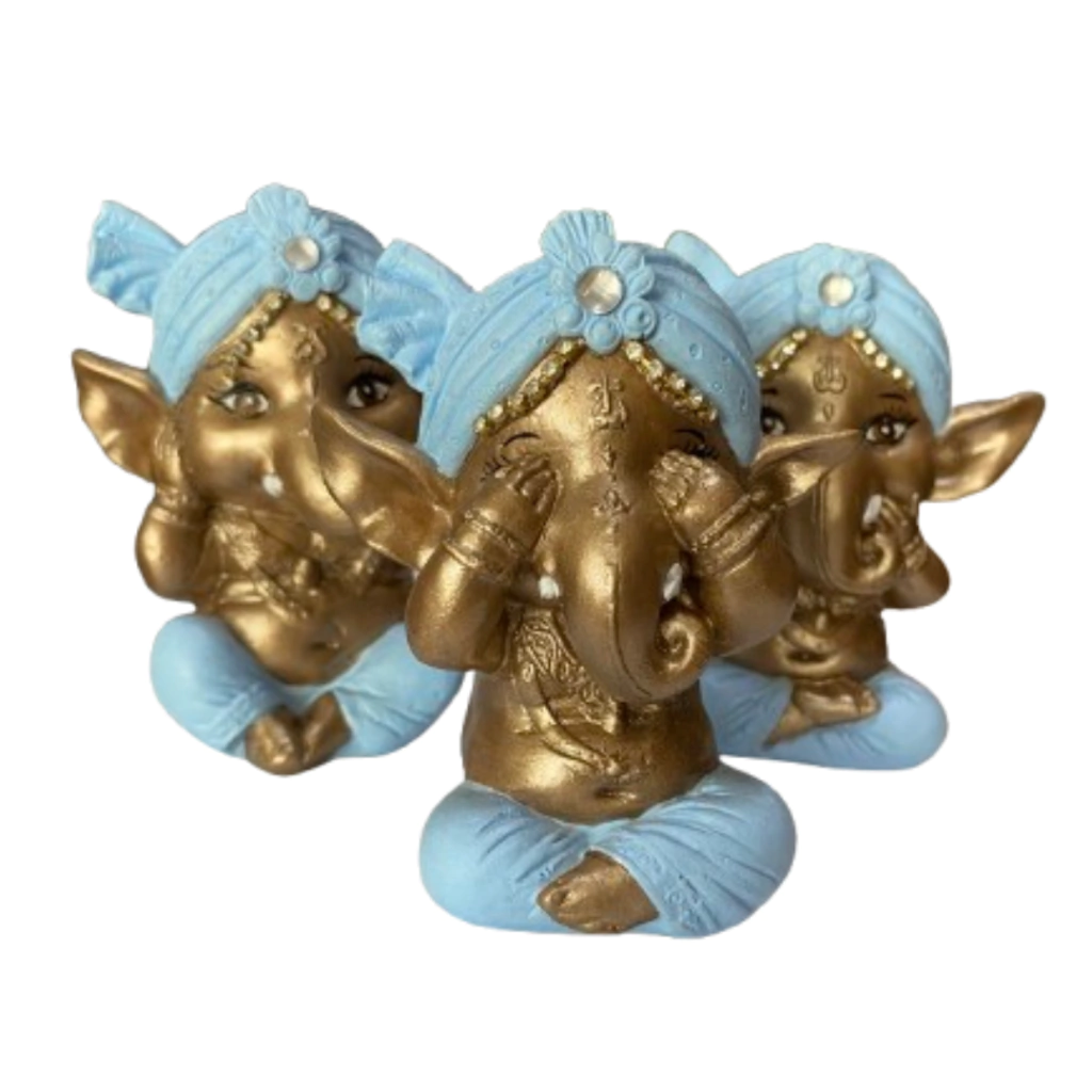 Ganesha é um Deus Indiano, conhecido como Deus do Intelecto, da sabedoria e da fortuna. Ganesha é o primeiro filho de Shiva e Parvati e é um dos deuses mais importantes da cultura Hindu. Ele é muito conhecido também como o removedor dos obstáculos. O Trio de Ganesha possui como mensagem, um famoso provérbio chinês de: Não vejo o mal, não falo o mal e não ouço o mal, no sentido de não disseminarmos fofocas, intrigas, energias negativas, karmas!